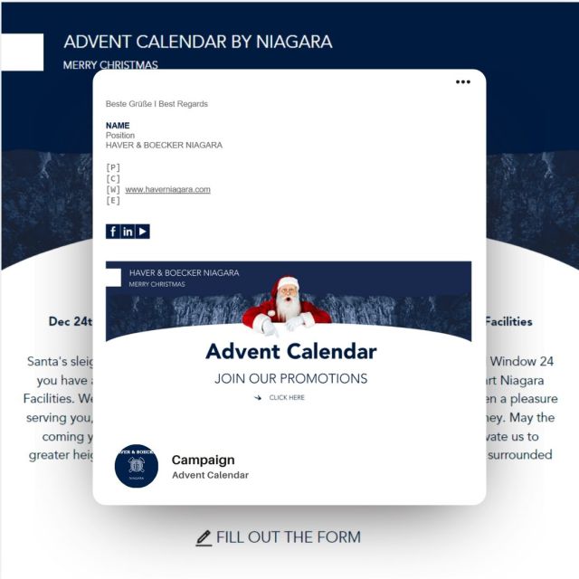 Christmas calendar campaign (Social Media, Email, PR, Website, Email-Signature): Independent organization of a communication campaign with an Christmas calendar in offering promotions with service products.I Processing time: 3 weeks I Results: 3 new leads generated; organization of a customer day; increase in brand awareness and visibility of the service products of the company