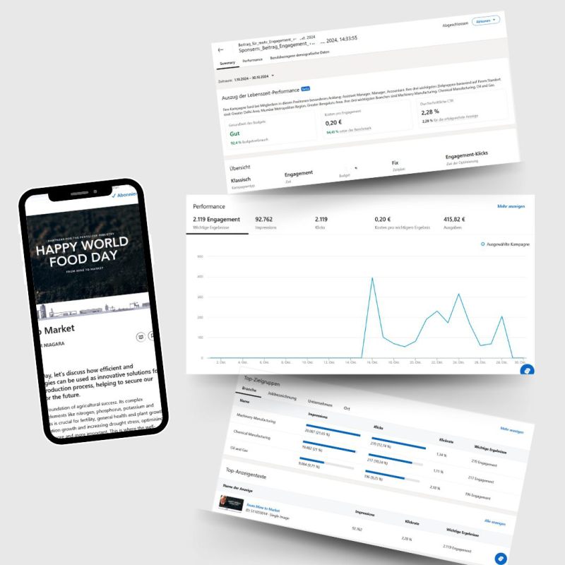 Campaign 1,:I launched a LinkedIn newsletter targeting the fertilizer market to increase engagement. Running for one week, this campaign achieved a 2.28% CTR, with a cost per engagement of €0.20, generating 2,119 clicks, 92,762 impressions, and 2,100 new subscribers.